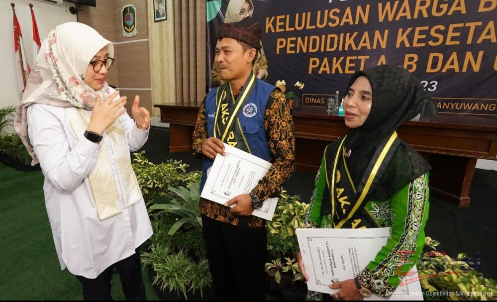 BANYUWANGI: Dalam upaya meningkatkan tata kelola pemerintahan, Pemkab Banyuwangi juga memberikan atensi di bidang pendidikan. Bahkan Bupati Banyuwangi, Ipuk Fiestiandani pada Minggu (11/6/2023) mengukuhkan 10 ribu warga belajar pendidikan kesetaraan Paket A, B, dan C dari seluruh Pusat Kegiatan Belajar Masyarakat (PKBM) Banyuwangi, di Aula Dinas Pendidikan Kabupaten Banyuwangi.