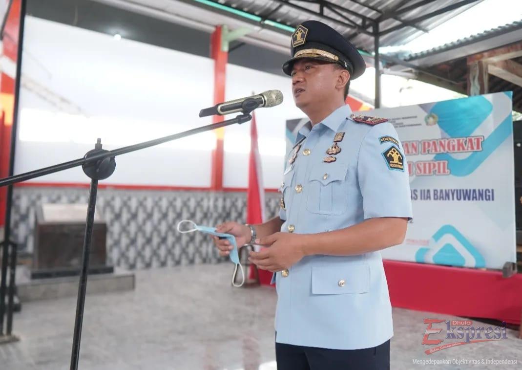 BANYUWANGI: Sebanyak 48 orang pegawai Lapas Banyuwangi resmi memperoleh kenaikan pangkat setingkat lebih tinggi. Hal itu ditandai dengan pelantikan kenaikan pangkat yang dipimpin langsung oleh Kalapas Banyuwangi Wahyu Indarto, Senin (4/7/2022).