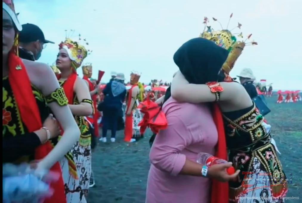 BANYUWANHI: Di balik kesuksesan pagelaran kolosal Gandrung Sewu di Pantai Marina Boom Banyuwangi, diwarnai tangis keharuan antara rasa puas dan bangga berpadu jadi satu, Sabtu sore (29/10/2022). Hal itu terjadi setelah ending, sejumlah orang tua para penari dipersilahkan memasuki arena. Mereka mencari anaknya masing-masing dan memberikan peluk dan kecupan rasa sayang dan bangga.